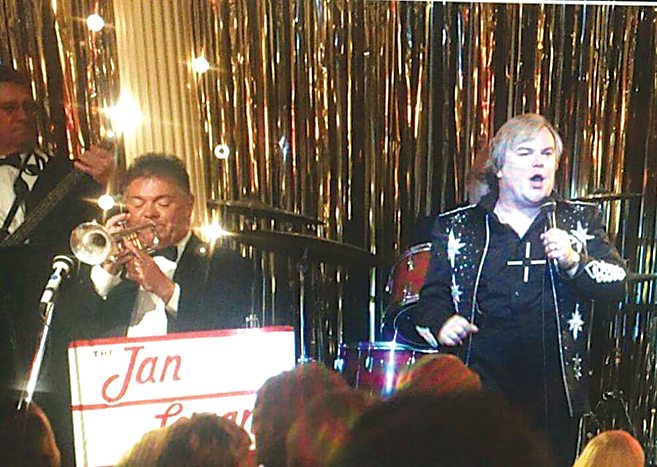 With a trumpet pressed to his lips, Steve Saive stands on a stage next to movie star Jack Black as he belts out a tune.