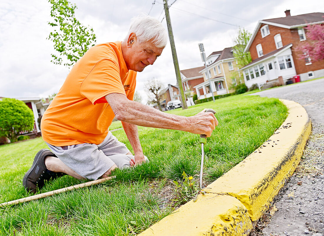 Brenda Beam cleans up around the rocks and ground covering in front of her South 26th Street home in Altoona on Tuesday afternoon. Mirror photo ...