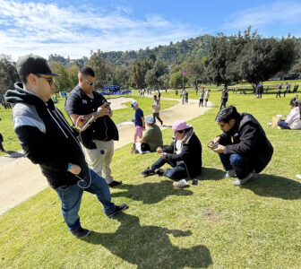 A group of Pokemon Go trainers hang out together in the Central Village habitat of the in-person park experience at Pokemon Go Tour: Kalos - Los Angeles. In the Central Village habitat, trainers could purchase food at a food truck vendor, meet notable trainers at a special tent (pictured in the background) and catch exclusive Pokemon in the game. Mirror photo by Matt Churella