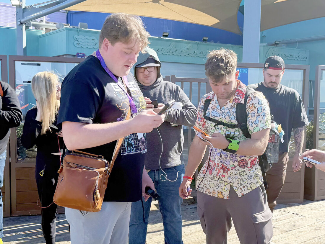 - Pokemon Go trainer MoneyShua, of Altoona, (at left) battles in a raid with content creator Tony TM (second from right), who was livestreaming the game Saturday, Feb. 21 at the Santa Monica Pier. Mirror photo by Matt Churella