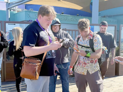 Pokemon Go trainer MoneyShua, of Altoona, (at left) battles in a raid with content creator Tony TM (second from right), who was livestreaming the game Saturday, Feb. 21 at the Santa Monica Pier. Mirror photo by Matt Churella