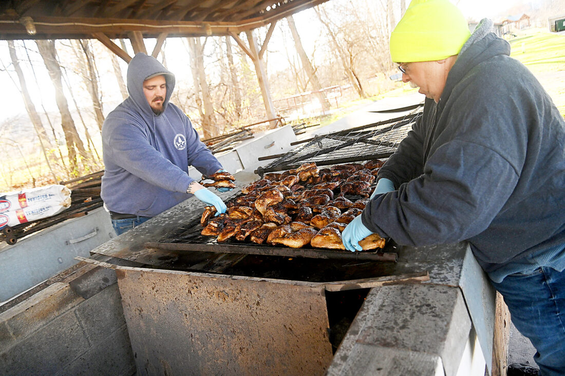 Duncansville Volunteer Fire Company assistant chief Dylan Zeiders (left) and fire police captain Jim Fox finish cooking 62 half chickens at the pit at Duncansville Memorial Park on Monday afternoon. The barbecue chicken was for a Monday evening borough-sponsored event.