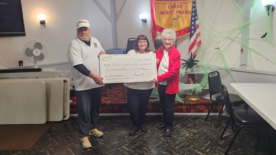 The Altoona Moose Lodge #74 presented a check for $1,000 to the Armed Forces Mothers to help send Christmas boxes to U.S. troops. Lodge President Mike Smith is shown with Patti Davis (center) and Helen Hoover from the Armed Forces Mothers.