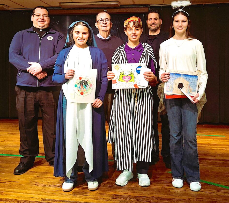 Council No. 522, Ebensburg Knights of Columbus, recently held its annual “Keep Christ in Christmas” poster contest at Holy Name Catholic School. Winners were (from left): Lillian Rhoads (second place), Cole Brown (third place) and Haley Eckenrode (first place). Others in the picture are (from left): Father Brian Warchola (pastor at Holy Name Parish), Charlie Moyer (committee chairman) and Steve Balog (Grand Knight).