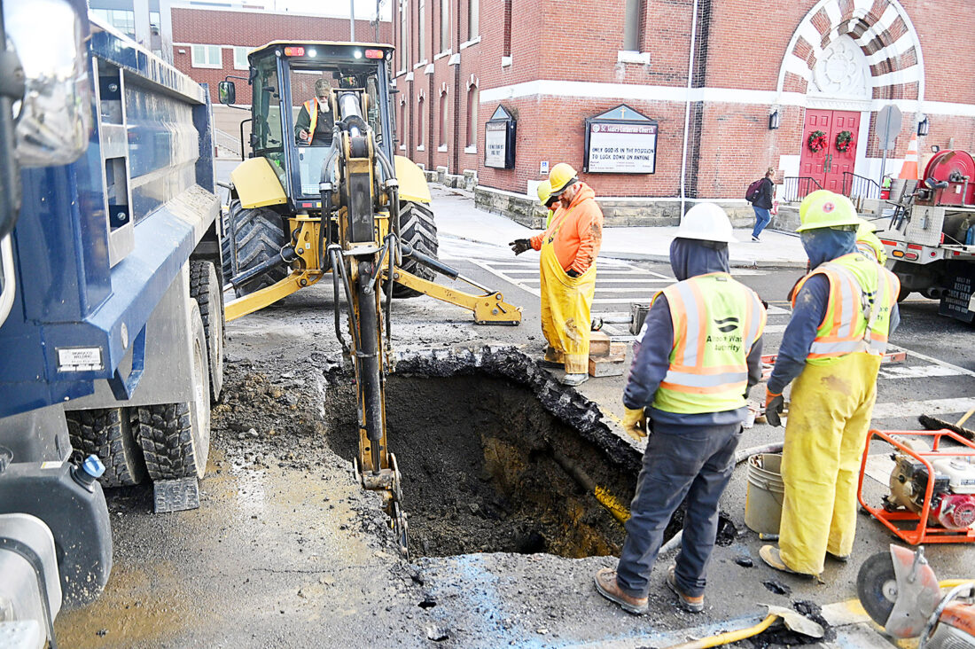 A crew from Altoona Water Authority dig at Eighth Street and 14th Street on Monday afternoon to make repairs to the broken water line feeding Altoona Area Junior High School.