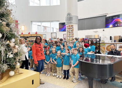 As accompanist Vince Eilenberger (right) plays piano, Arrows Christian Academy students and staff gather around the Christmas tree at UPMC Altoona on Monday during the annual tree lighting ceremony. Mirror photo by William Kibler