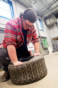 - Admiral Peary Area Vocational Technical School senior Tomas Lee of Portage Area High School works to mount a lawn tractor tire in the Motorcycle Service Technology competition during the SkillsUSA Pennsylvania Division 7 Competition at Roundhouse Harley-Davidson in Duncansville on Tuesday. Mirror photo by Patrick Waksmunski