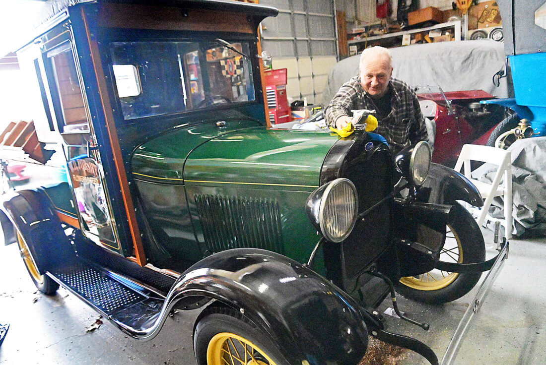 Bill Forsht of Juniata wipes down his 1928 Ford Model A Huckster after returning home from a Tuesday afternoon drive.