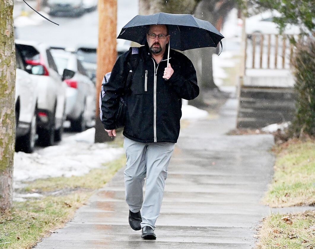 Blair County Veterans Service Officer Mike Campagna walks in the rain to his car along Union Street after work at the courthouse on Thursday afternoon.