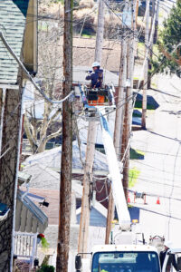 A lineman from Communications Construction Group runs cable through an alley between the 1100 block 21st and 22nd Streets on Tuesday afternoon. Mirror photo by Patrick Waksmunski