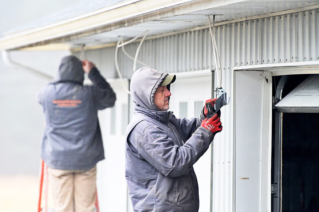 Electricians Kris Digruilles (right) and Brennen Dugan of Brent Cogan Electrical Services, Duncansville, wire in exterior light fixtures for a garage along Turkey Valley Road in Frankstown Township on Wednesday afternoon.