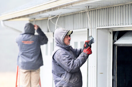 Electricians Kris Digruilles (right) and Brennen Dugan of Brent Cogan Electrical Services, Duncansville, wire in exterior light fixtures for a garage along Turkey Valley Road in Frankstown Township on Wednesday afternoon. Mirror photo by Patrick Waksmunski