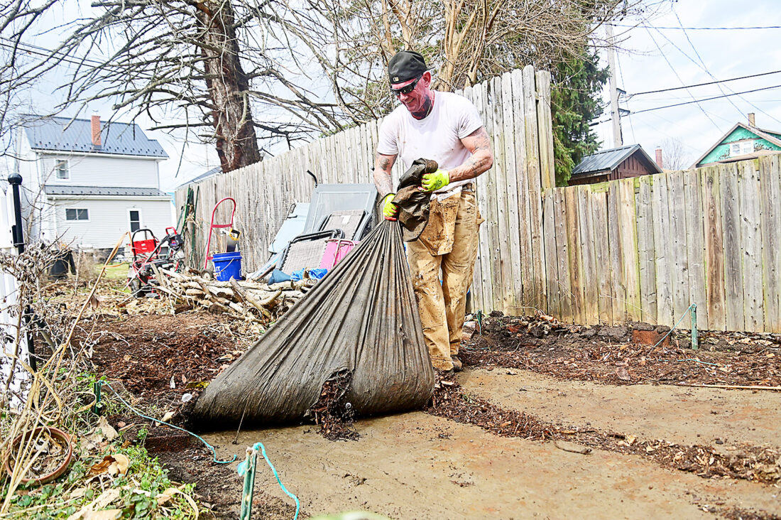 Frankie Reed tears up the felt flooring of his former greenhouse in preparation for installation of a new one behind his West 11th Avenue home in Juniata on Tuesday afternoon. Mirror photo by Patrick Waksmunski