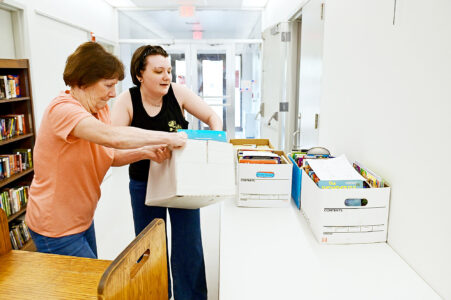 Friends of Altoona Public Library volunteers Patty Marx (left) and Madeline Black set up for the Spring Used Book Sale on the ground floor of the library on Thursday morning. The sale runs from 8:30 a.m. to 5 p.m. today, April 24, 9 a.m. to 4 p.m. Saturday, April 25, and 8:30 a.m. to 6 p.m. Monday, April 27. Monday is $5 a bag day.