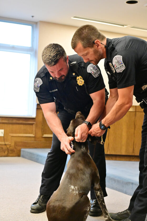 Hollidaysburg Police Chief Richard Oldham attaches a police badge to K-9 Officer Dea as handler Hollidaysburg Officer Bryan Ketner assists.