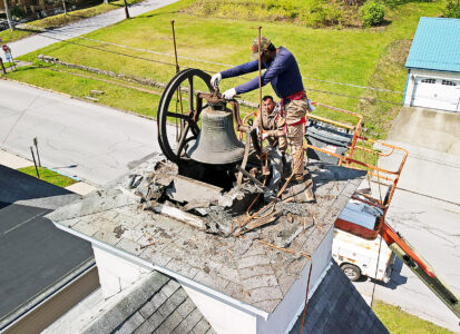 A crew from Cambria Exteriors, Portage, work to remove the bell from Ss. Peter & Paul Orthodox Church at 1006 Fifth Ave. in Patton last week. The cross and dome had already been removed.