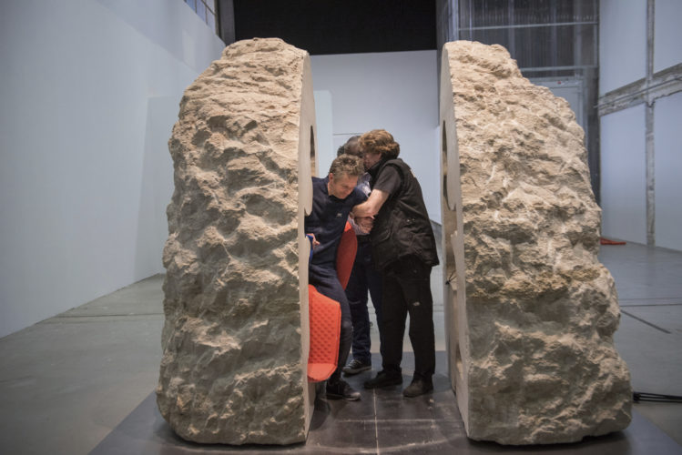 On Wednesday workmen pulled apart the two halves of the rock and Poincheval gingerly climbed out. He made a V-for-victory sign as two men helped him to a chair at the Palais de Tokyo gallery.