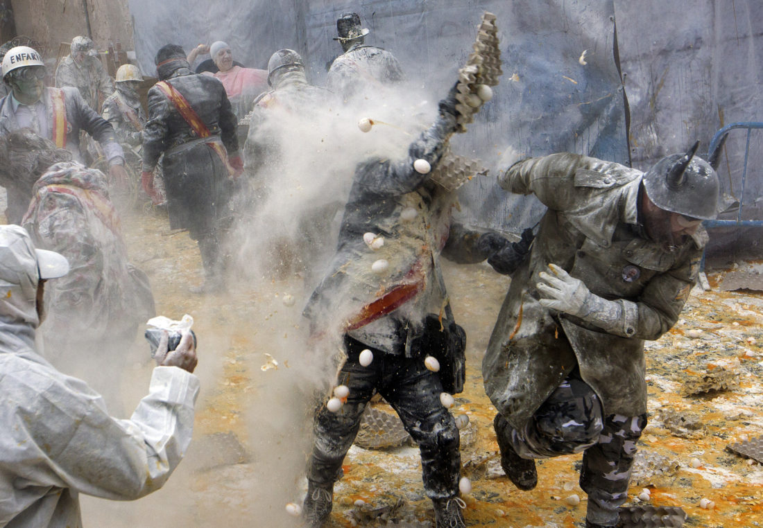 The Associated Press Revellers take part in the festival of Els Enfarinats, in the town of Ibi near Alicante, Spain, Friday, Dec. 28. For about 200-years the inhabitants of Ibi annually celebrate with a battle using flour, eggs and firecrackers, outside the city town hall.
