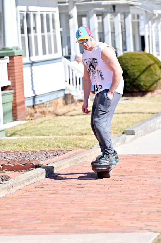 Curtis Miller of Tyrone rides his Onewheel self-balancing electric skateboard on the sidewalk along West 15th Street in Tyrone on Monday afternoon. Mirror photo by Patrick Waksmunski
