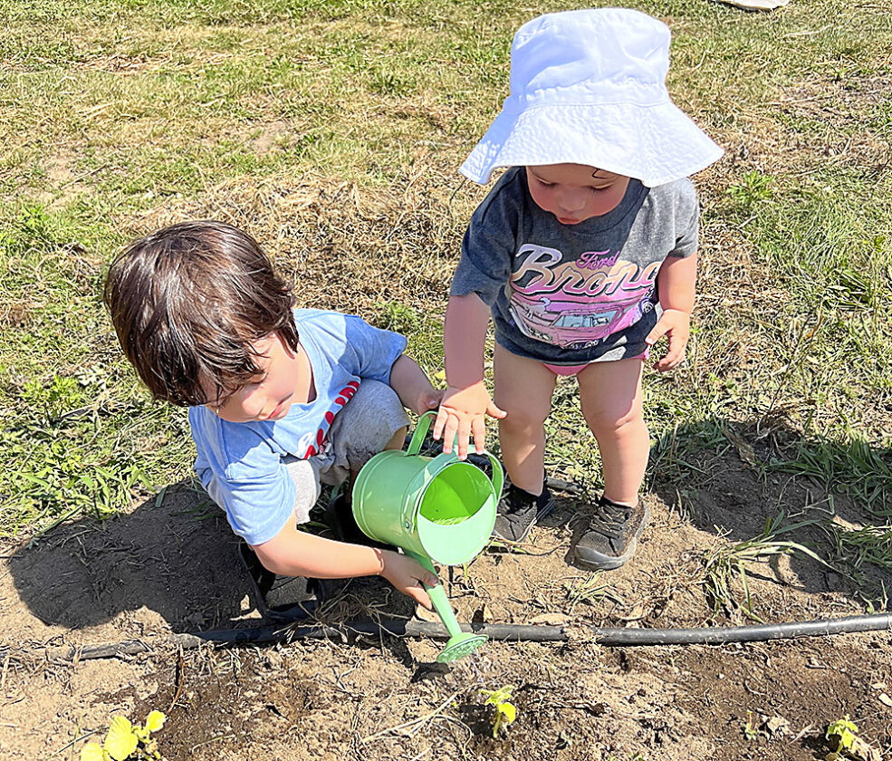 Nico Rivera, 4, and MaryAnna Rivera, 1¢, water their newly planted cucumber seedlings on July 8 at Crossroads Farm in Malverne, N.Y. Photo by Dina Colon via AP