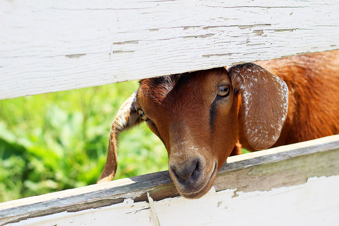 By Colette Costlow A playful goat hangs out in the shade by Hilltop Produce.