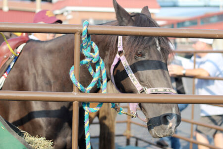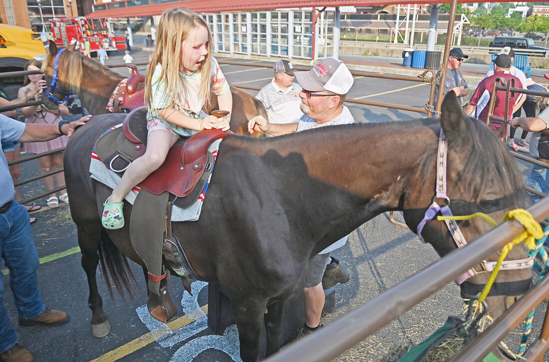 - Bryan Roush of the Jaffa Mounted Patrol helps Paisley Parks mount Rocky Mountain Horse “Mick” during Altoona’s National Night Out activities at Heritage Plaza on Tuesday evening. Mirror photo by Patrick Waksmunski