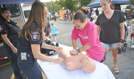 AMED EMT Taylor Shildt introduces CPR to Brynlee Dryburgh, 10, of Altoona during Altoona’s National Night Out activities at Heritage Plaza on Tuesday. Mirror photo by Patrick Waksmunski