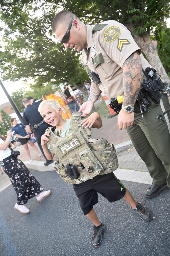Cpl. Shea Strayer of the Logan Township Police Department helps Jace Smith, 9, of Altoona don a protective vest during Altoona’s National Night Out activities at Heritage Plaza on Tuesday evening. Mirror photo by Patrick Waksmunski
