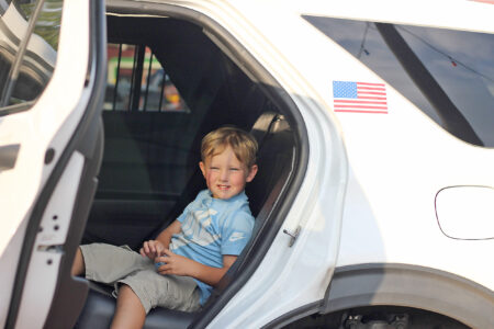 - Kade Barnhill, 5, gets a peek inside the backseat of an Altoona police car. Mirror photo by Colette Costlow