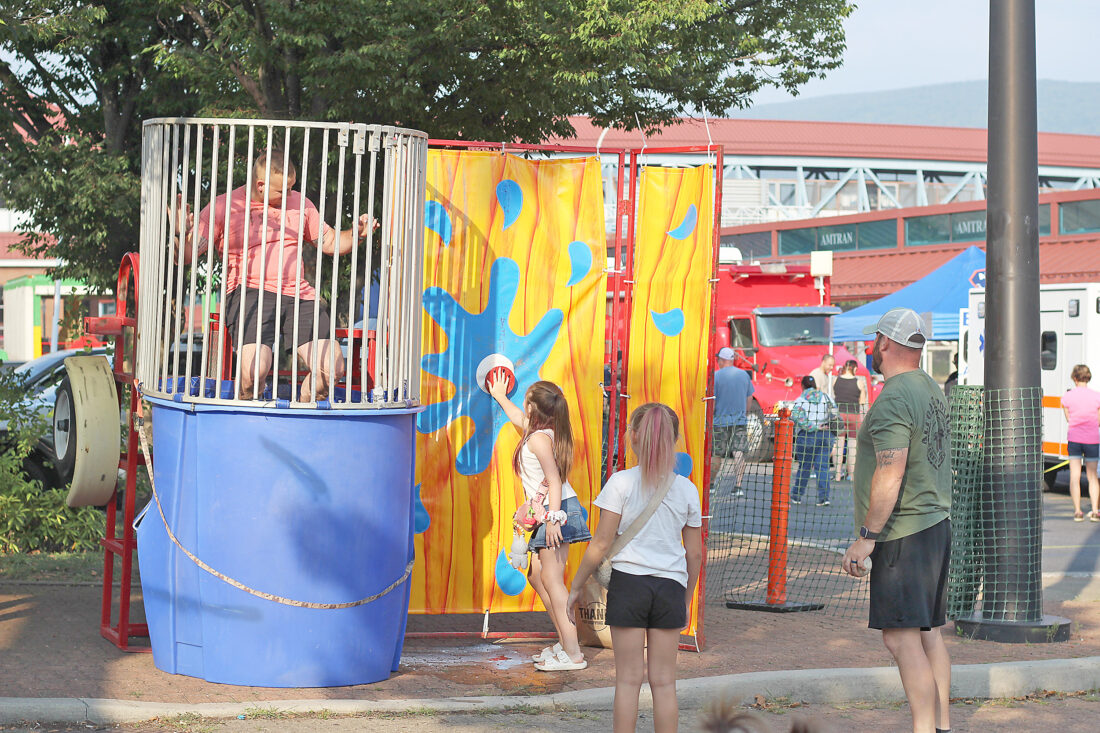 - Avery Hughley, 8, presses the dunk tank button, sending Altoona police officer T.J. Wendt into the water while Aroara Wineland, 10, watches from behind. Mirror photo by Colette Costlow
