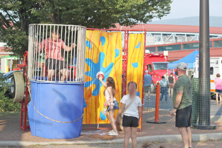 Avery Hughley, 8, presses the dunk tank button, sending Altoona police officer T.J. Wendt into the water while Aroara Wineland, 10, watches from behind. Mirror photo by Colette Costlow