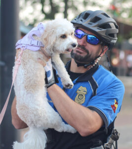 Sgt. Matt Plummer holds Nova in the air at National Night Out. Mirror photo by Colette Costlow