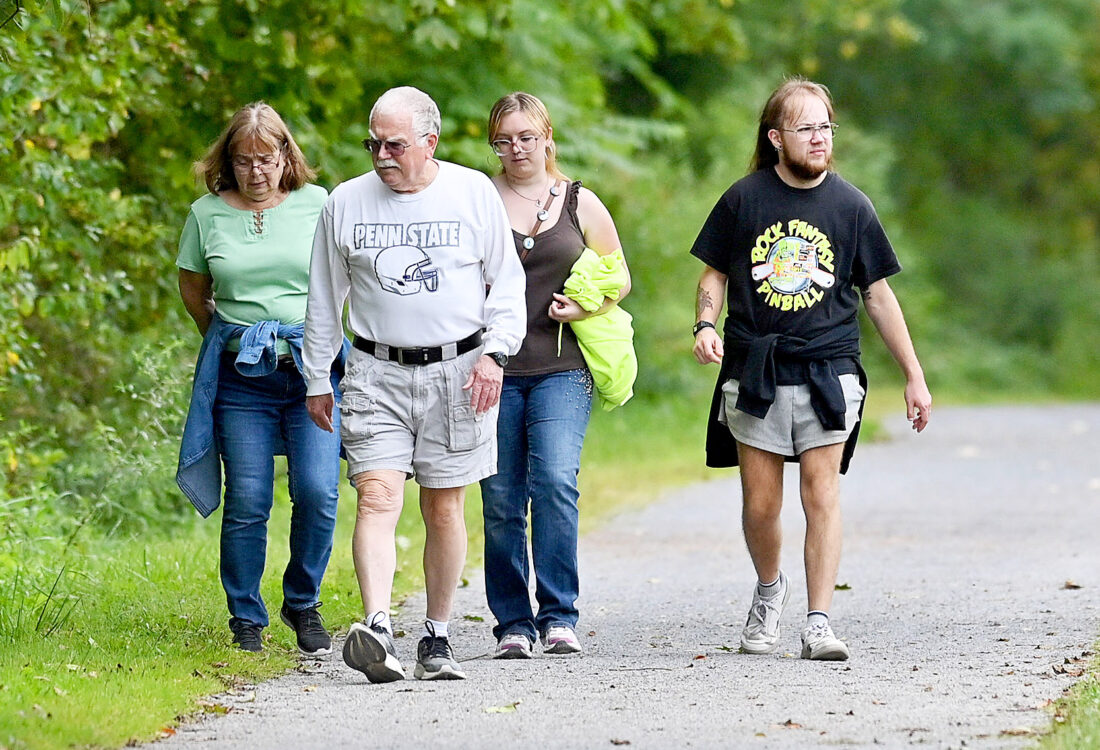 Greg and Gin McDonnell (left) of Portage walk with their granddaughter, Jamie Spear, and her husband, Daniel Spear, of Wurtsboro, N.Y., along the Ghost Town Trail in Ebensburg on Tuesday afternoon.