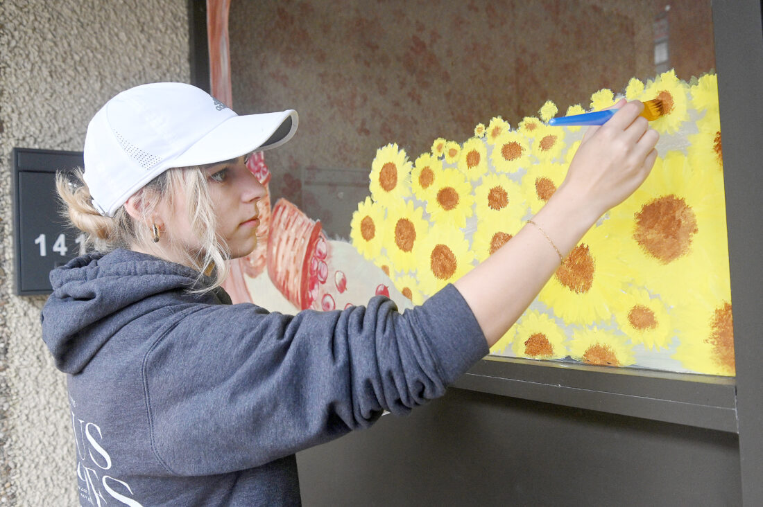 Crowner Boutique associate Savannah Dodson paints a fall scene on a front window of the 11th Avenue shop in Altoona on Tuesday afternoon.