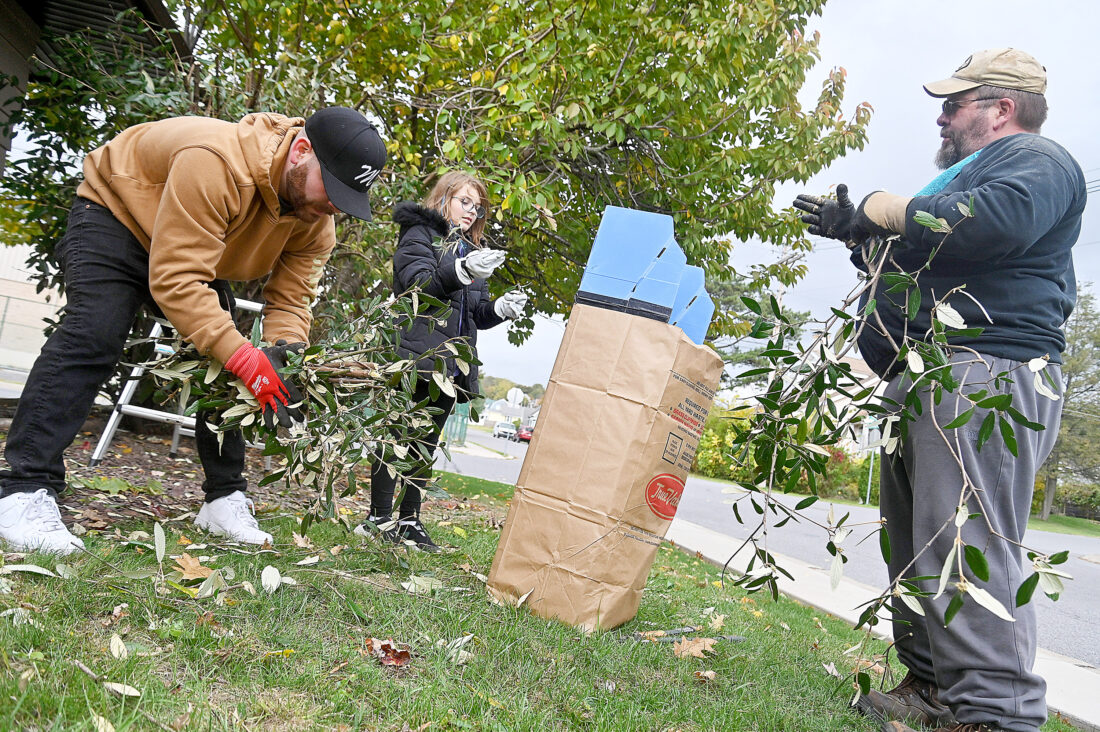 Chris McCarthy (left) and his daughter, Isabelle McCarthy, 11, help his father David McCarthy trim a tree in front of his Roselawn Avenue home in Altoona on a recent afternoon.
