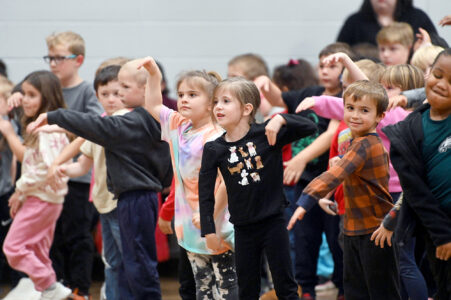 Students at Juniata Elementary School “swim” as they learn about the oceans during a Science Rocks program.