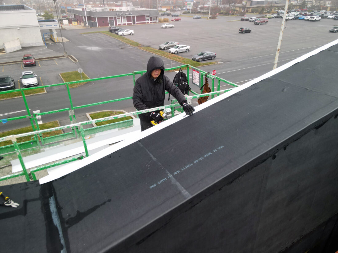 Shatee Vongsouvanh of 814 Services, Altoona, installs fascia in front of the Shoe Fly expansion at the Pleasant Valley Shopping Center on Thursday afternoon.