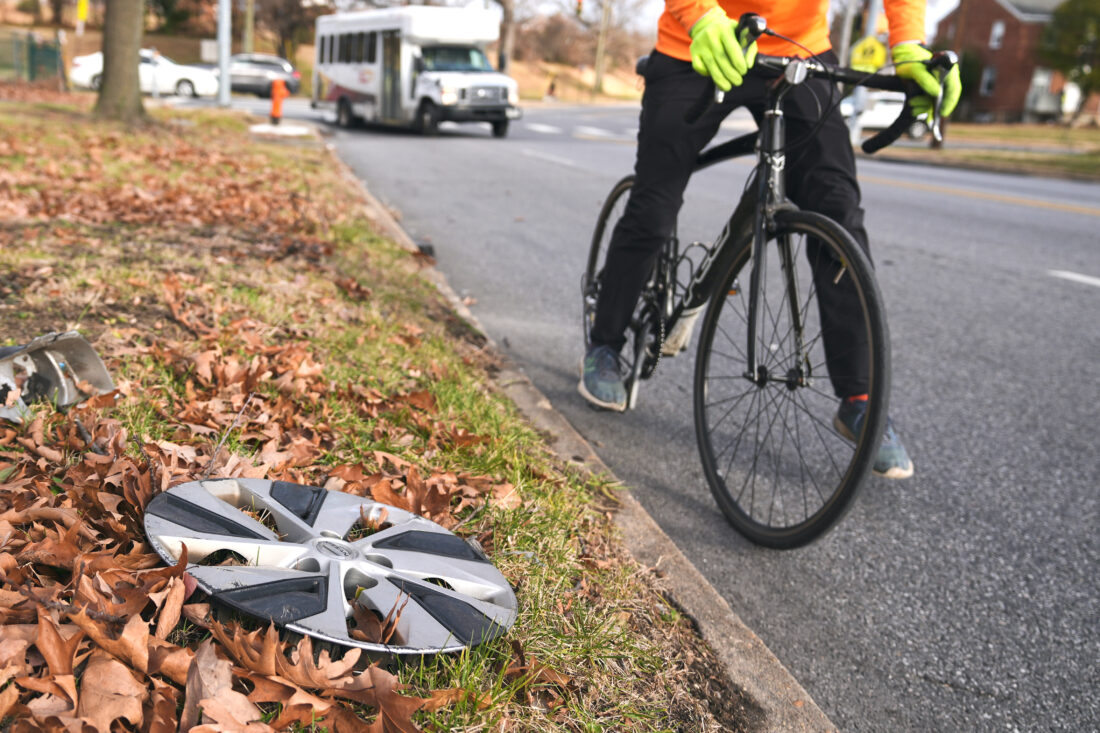 - Cyclist Barnaby Wickham steps down and dismounts his bike after spotting a lost hubcap on the side of the road, Thursday, Dec. 11, 2025, in Baltimore. (AP Photo/Stephanie Scarbrough)