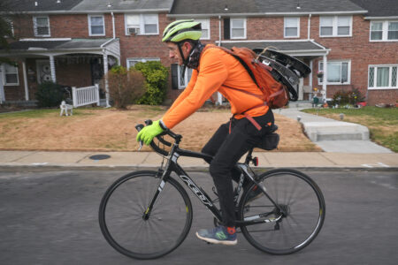 - With hubcaps fastened to his backpack, cyclist Barnaby Wickham pedals through a neighborhood on his journey home, Thursday, Dec. 11, 2025, in Baltimore. (AP Photo/Stephanie Scarbrough)