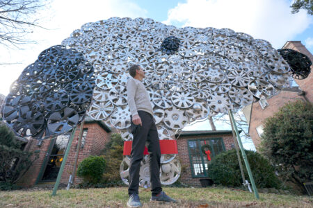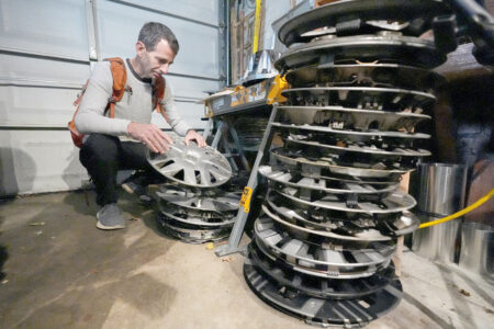 - Cyclist Barnaby Wickham poses for a portrait in front of his art structure made from hubcaps, Thursday, Dec. 11, 2025, at his home in Baltimore. (AP Photo/Stephanie Scarbrough)