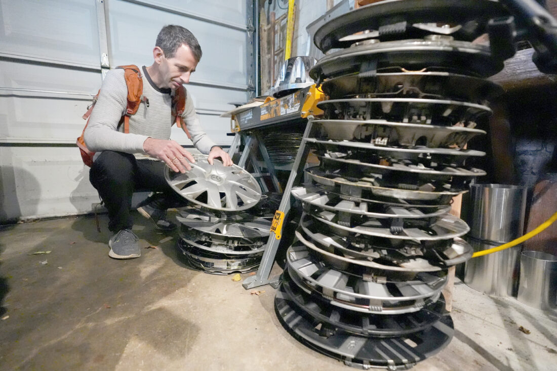 - Cyclist Barnaby Wickham sorts through his collection of hubcaps stored in his garage, Thursday, Dec. 11, 2025, at his home in Baltimore. (AP Photo/Stephanie Scarbrough)