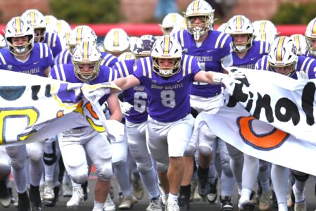 Bishop Guilfoyle heads onto the field as they take on Clairton in the PIAA championship game Thursday afternoon at Cumberland Valley’s Chapman Field in Mechanicsburg. The score in the third quarter was 22-3, with BG trailing. Check out Friday’s Altoona Mirror for all the action. Mirror photo by Patrick Waksmunski