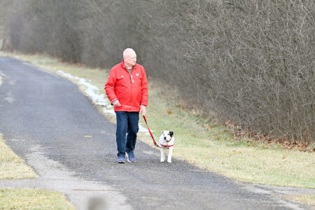 Rick Vanevenhoven of Hollidaysburg walks with Cara, his 10-year-old Dalmatian-mix, along the Hollidaysburg Area High School pathway near North Montgomery Street on Thursday afternoon.