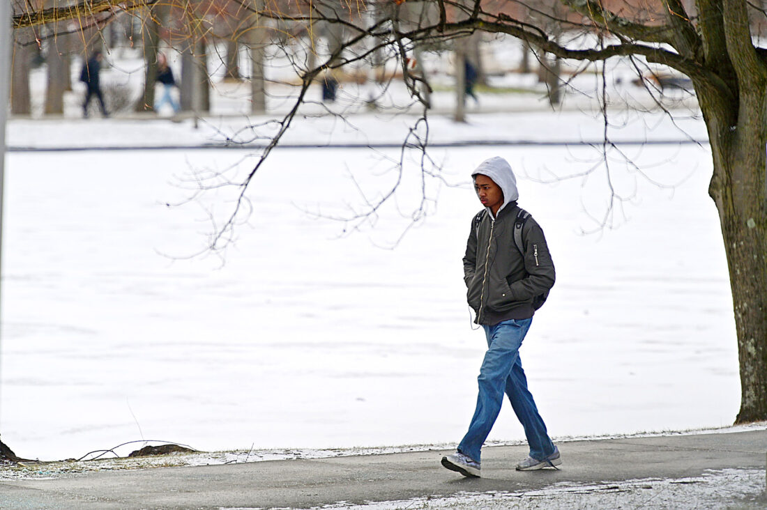 A Penn State Altoona student walks along the frozen Reflecting Pond on Thursday afternoon. Mirror photo by Patrick Waksmunski