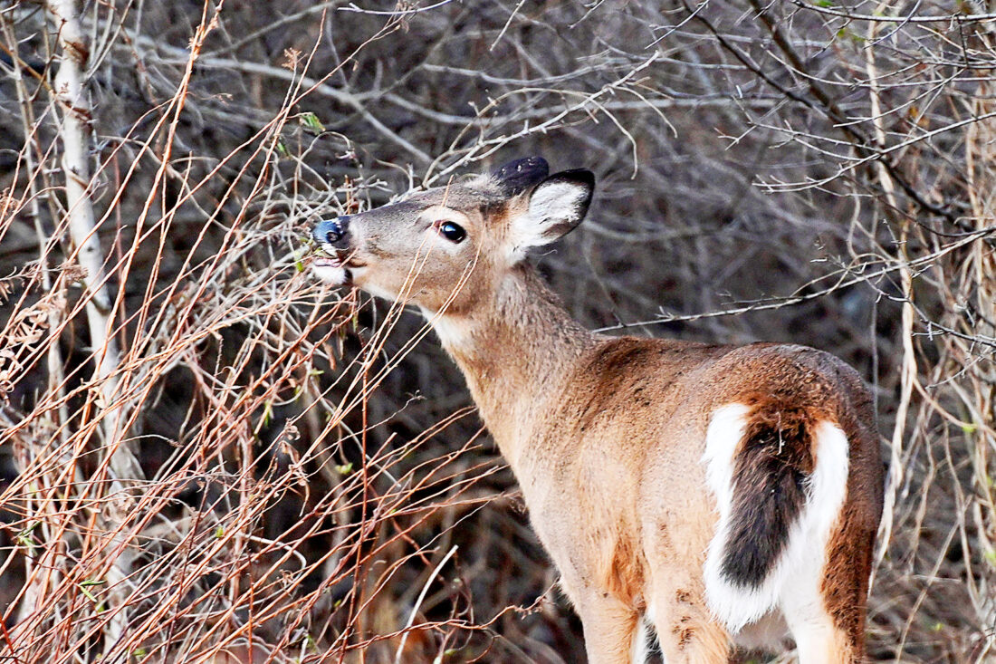 A young deer nibbles on a branch along Cayuga Avenue in Altoona on a recent afternoon.