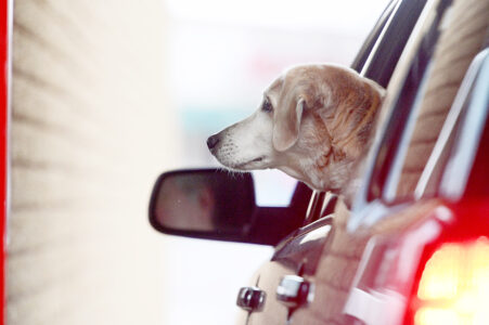 A dog patiently waits for a treat at the Giant Eagle Pharmacy drive-thru at Logan Town Centre on Thursday afternoon. Mirror photo by Patrick Waksmunski