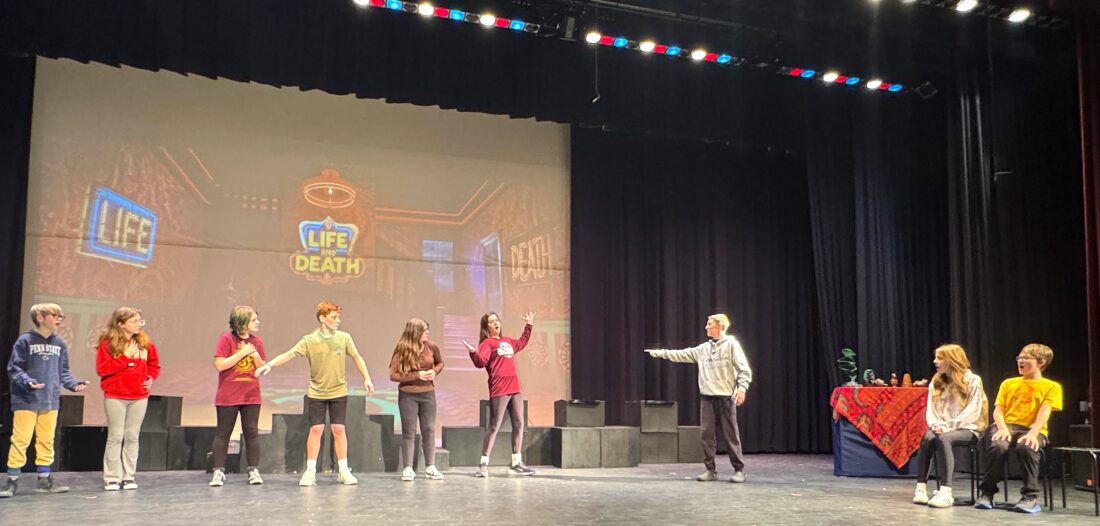 Courtesy photo Rehearsing a scene for the Altoona Area Junior High School’s upcoming production of “Beetlejuice, Jr.” are (from left): Darren Focht (Adam Maitland), Delilah Laich (Barbara Maitland), Molly Laird (Delia Schlimmer), Colin Amrhein (Charles Deetz), Ava DeGennaro (Lydia Deetz), Campbell Fleegle (Beetlejuice), Carter Monahan (Juno), Emma Harshbarger (Maxine Dean) and Gavin Lutz (Maxie Dean).