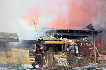 Multiple fire companies and dozens of firefighters responded about 8 p.m. Thursday to a barn fire at 4020 Johnstown Road, Portage. The call came in for a barn fully engulfed in flames, with an update given later stating that the barn collapsed. Regional fire companies responded with tankers and personnel, and created a fill station nearby to keep water flowing to firefighters. No additional information was available. Mirror photo by Patrick Waksmunski
