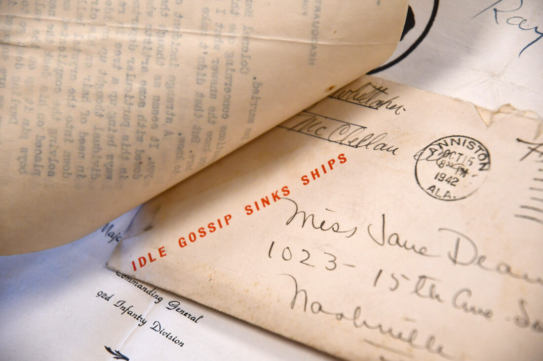 - An envelope from a Black soldier stationed in Alabama written to his wife in Nashville in 1942 shows a stamp that says “Idle Gossip Sinks Ships” Monday, Feb. 9, 2026 in Nashville, Tenn. (AP Photo/Kristin M. Hall)