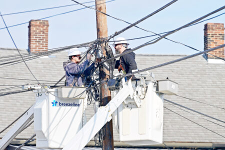 A crew from Breezeline works on a utility pole along Strawberry Alley in Hollidaysburg on Monday afternoon.